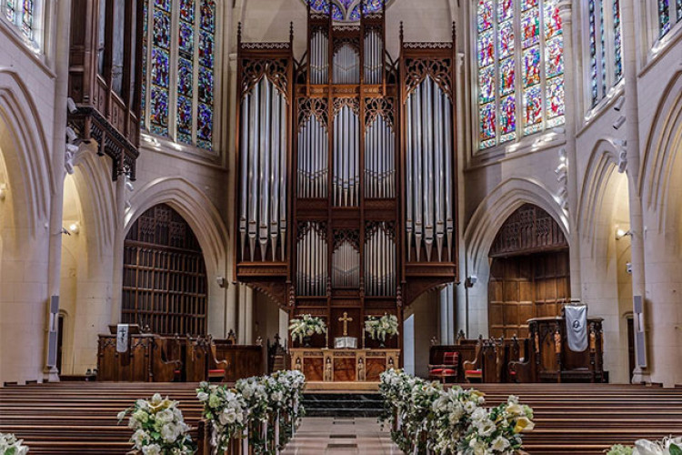 フランス・パリ、遊覧船や河畔を散策する人々で賑わうセーヌ川の畔に佇む、高い尖塔が目を引く教会。ティファニー社より寄贈されたステンドグラスが美しい教会でクラシカルウェディング。