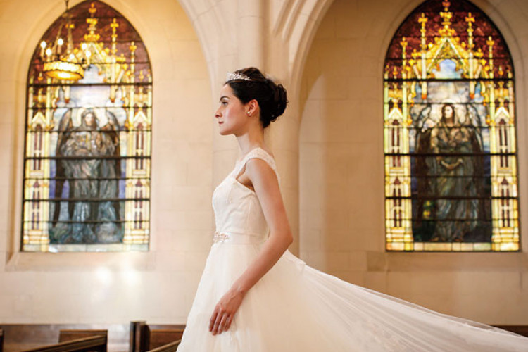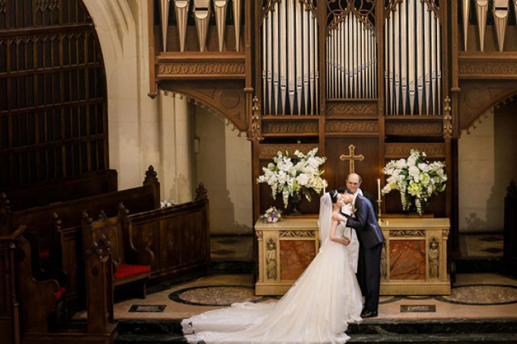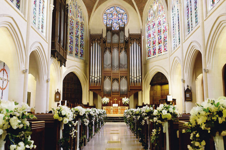 ティファニー社から寄贈された圧巻のステンドグラスをはじめ、天井のシャンデリアの煌きが調和された気品溢れる教会です。