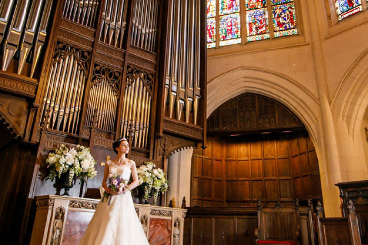 ゴシック様式の外観はひときわ重厚な雰囲気。アメリカンチャーチの様々なスポットで写真をのこしていただけます。