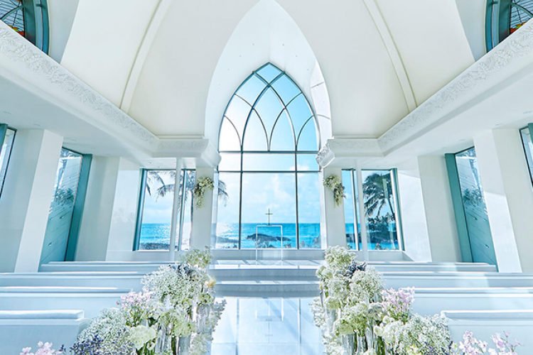 ハワイ王族にも愛されたコオリナリゾートのオン・ザ・ビーチに佇むダイヤモンド型チャペル。バンケットはチャペルに併設されている完全個室の専用会場。ビーチフロントの素晴らしい眺望がおふたりをお迎えします。