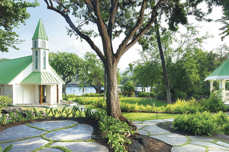 アウトリガー・コナ・リゾート&スパの敷地内にある、白い大理石のバージンロードと正面にケアウホウベイが広がるチャペル。ハワイのコナでオーシャンフロント・ウェディングが叶います。