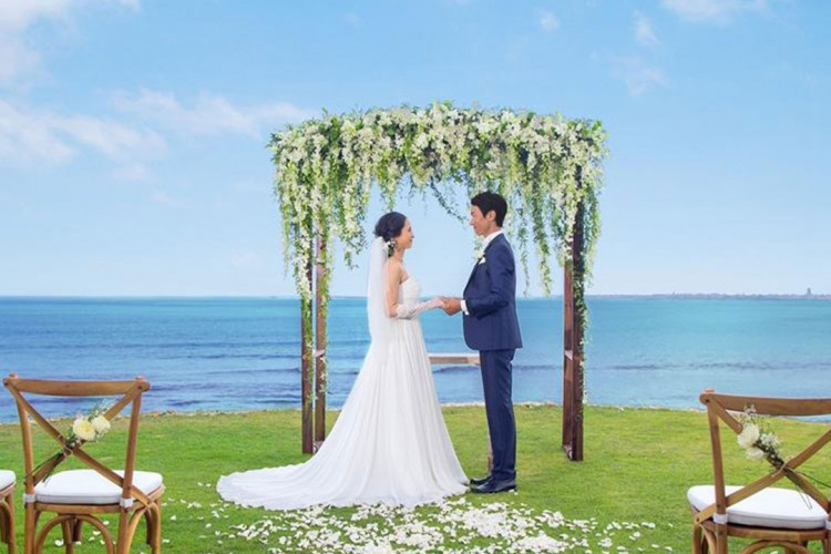 世界的ラグジュアリーホテル『フォーシーズンズ リゾート バリ アット ジンバラン ベイ』のプライベートで贅沢なガーデンウェディング。目の前には何もない海が広がり、開放的で贅沢なロケーションを独り占め。