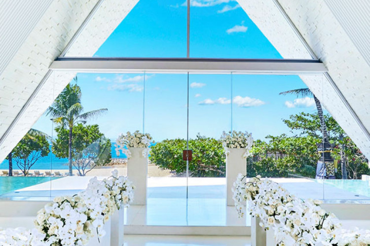 バリ島ヌサドゥアエリアの高級ヴィラリゾート「ザ・ロイヤル・サントリアン」の施設内にたたずむ白亜のビーチフロント・チャペル【ウル・シャンティ】。祭壇の無効には青く美しいビーチと緑深いガーデンが広がります