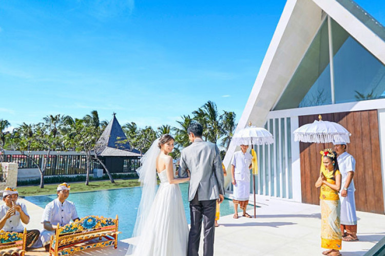 お得なキャンペーン開催中!組数限定の特別プラン販売!心地よい潮風に揺れる水辺に浮かぶチャペル。祭壇の奥に広がるのは、白砂のビーチと紺碧の海。バリの海・風・光を感じるヴィラリゾート。