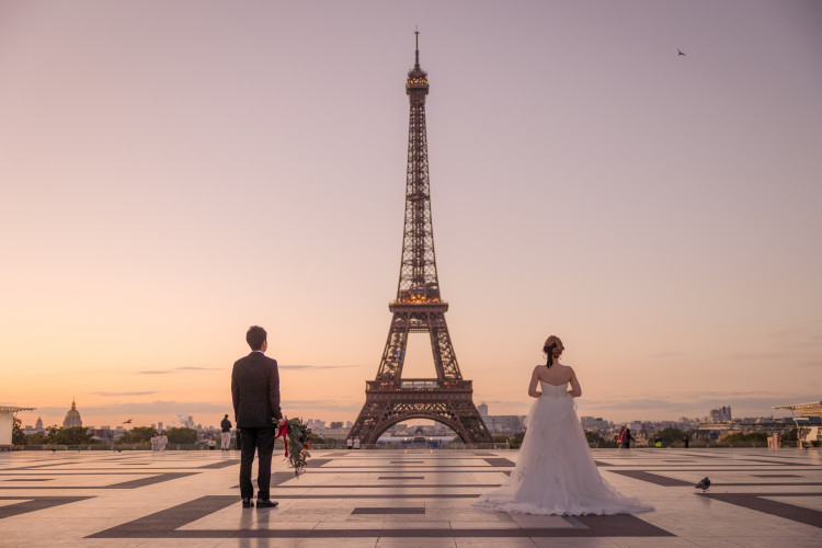 パリのまだ人が少ない時間に撮影する「早朝フォト」。最大5カ所で撮影で約150枚データに加えて動画撮影も!(約1分~1分半編集) 更にHISなら衣裳ブランドが3社から選べる!事前に日本試着もOK!