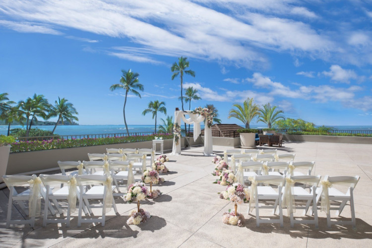 ハウテラスラナイはダイヤモンドヘッドと聖なる海カヴェヘヴェヘを望むオープンエアの会場。青空と癒しの海、ダイヤモンドヘッドに祝福されるハワイらしい風景は絶景。<挙式時間>10:00 ※月曜日~木曜日限定