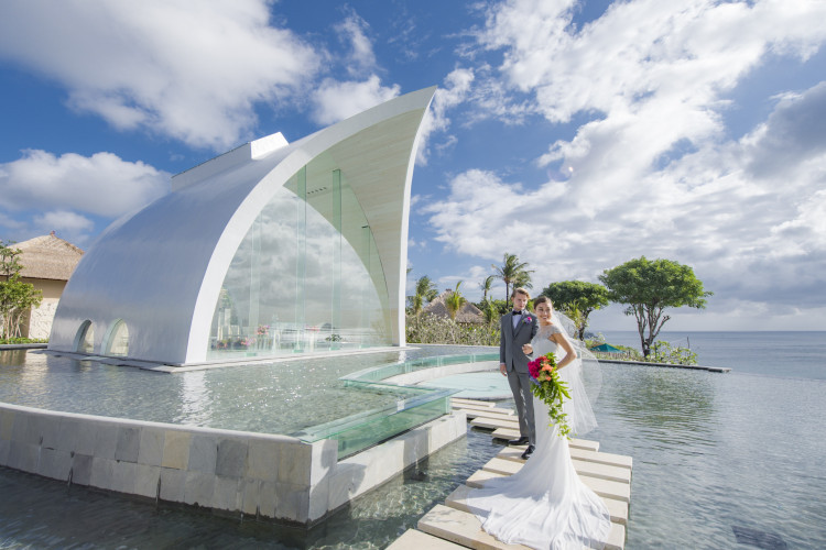 外形は大きく羽ばたく鳥のような、白いフォルム。 窓の外にはインフィニティプールから連続する紺碧のインド洋と空が広がり、大きな自然の中で祝福されるような挙式が行えます。