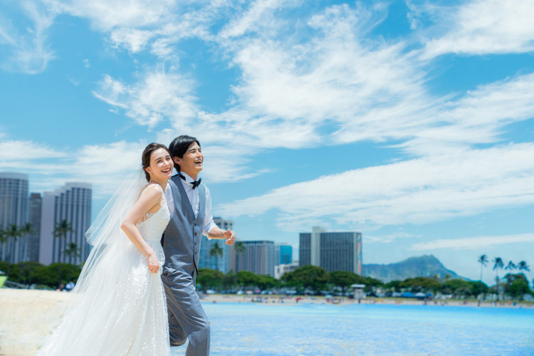 《手ぶらでGO》ハワイへのハネムーンを兼ねて素敵な写真を撮影したいカップルにおすすめの特別プラン。レンタル衣装や小物、ブーケなどがすべて揃っているので、事前の準備も簡単です♪