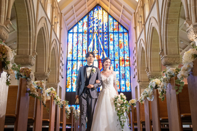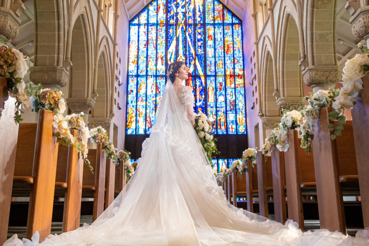 オアフ島で人々に長く愛されているセント・アンドリュース大聖堂。その壮麗なステンドグラスが壁一面に広がる中、まるで本番さながらの挙式シーンを撮影します。