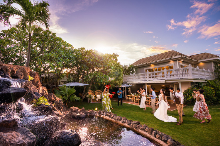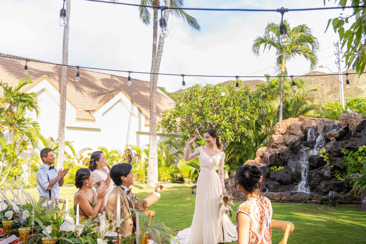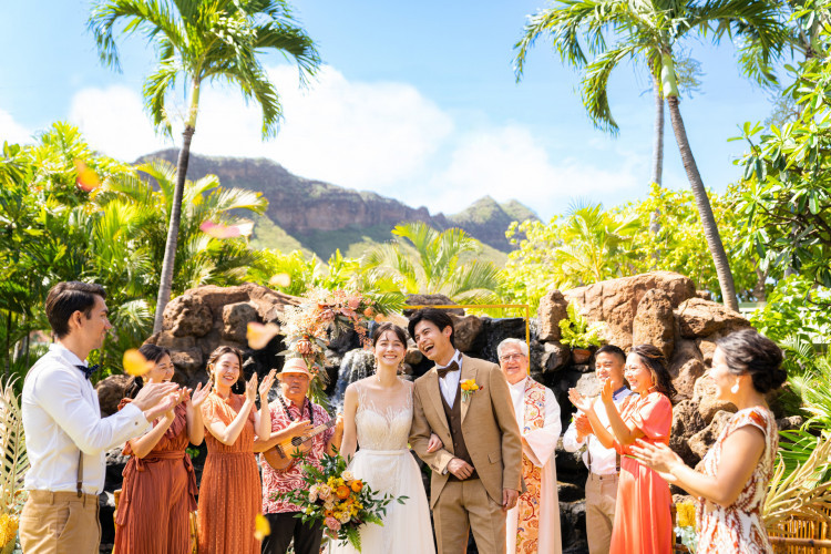 【ガーデン挙式基本代金24万8000円→0円】ダイヤモンドヘッドを望むガーデンで、清らかな水の音や南国の風を感じながらのセレモニー♪挙式後のスパークリングワイン乾杯セレモニーもセット!