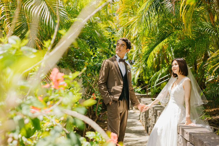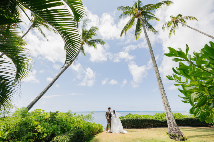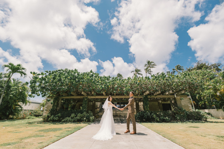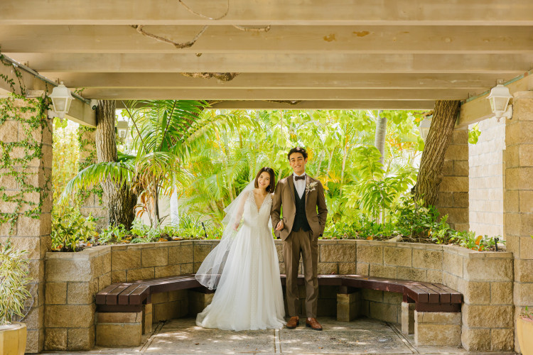 エントランスには緑のトンネルやヤシの木が生い茂り、まさに南国ムード満載 お二人はもちろん、ゲストもハワイに来たことを肌で感じることができる教会です