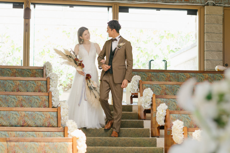 教会の中はウッド調でできており、オールドハワイの雰囲気が漂います よく見てみると参列席の柄もヤシの木デザインなのがポイント!