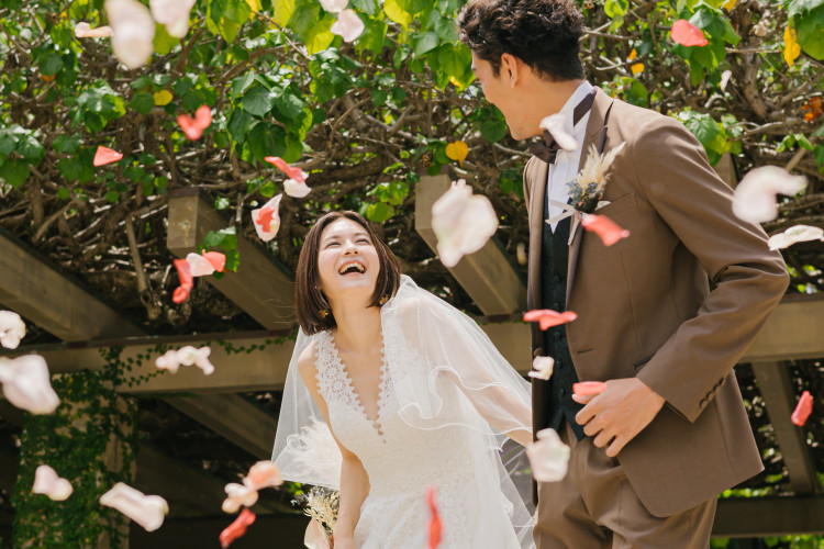 挙式後のセレモニーとして人気のフラワーシャワーセレモニー 緑のトンネルをバックにお写真映えすること間違いなし!