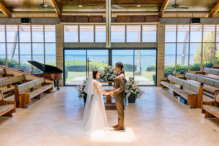 祭壇の向こう側にはガーデンと海が広がる絶景ロケーションの本格派教会 ウッド調でオールドハワイの雰囲気が漂う教会でハワイならではの挙式を…