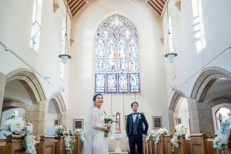 石造りの外観は、こぢんまりとした教会ながらも気品と重厚感を感じさせる佇まい。チャペルの中はアーチ型の高い天井が広がり、木造の温かみを感じることができるクラシカルな空間での挙式が叶う!