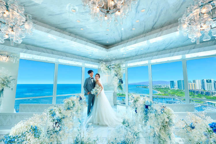 ハワイアンブレッシングセレモニーがこの金額で可能に♪スペシャルプラン ピュアホワイトで統一されたチャペルから差し込む太陽の光を燦々と浴びキラキラと輝くシャンデリアは、より一層チャペルを輝かせます。
