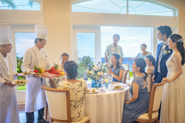 チャペル隣にオーシャンビューのパーティー会場が併設されてます。ホノルル日本領事館で総料理長を務めた日本人シェフが手掛けるお食事を、2時間ゆっくりとご堪能ください。