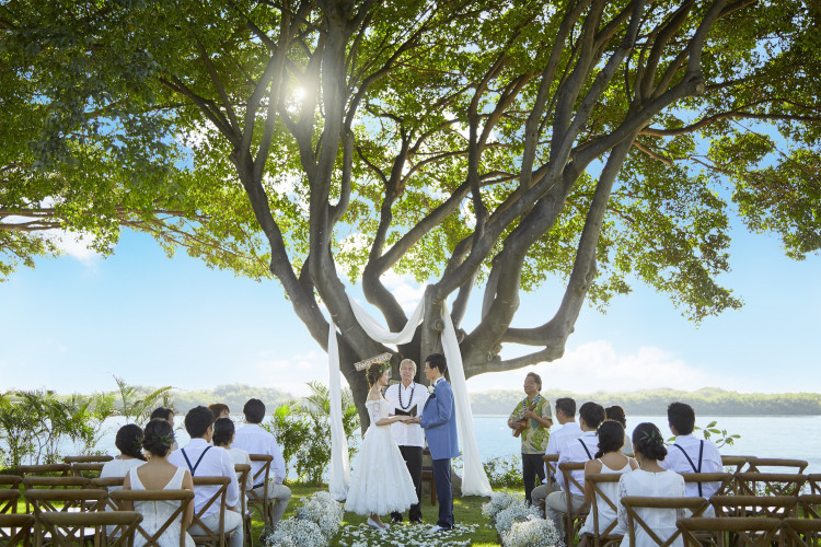 咲き誇るプルメリアの香りとハワイの水平線が南国気分を一層引き立てる広大なガーデン。ファミリーツリーと呼ばれる大きな木の下でウェディング!大きな木に包まれた木漏れ日で比較的涼しくお過ごしいただけます。