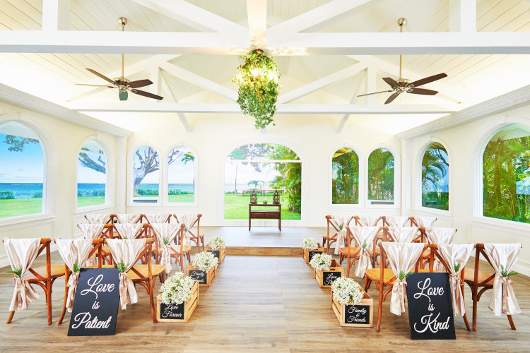 バックアップチャペルをご用意しているので雨天時でも安心。ハワイの風が吹き抜けるオープンエアな開放感あふれる挙式が可能。