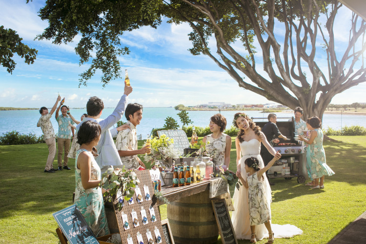 目の前に広がるハワイの水平線がリゾート気分を感じさせる広大なガーデン。屋外での会食パーティーやバーベキューなど好みのスタイルを。スイーツブッフェやドリンクバーも用意して、想い出の写真を沢山残して。