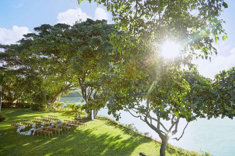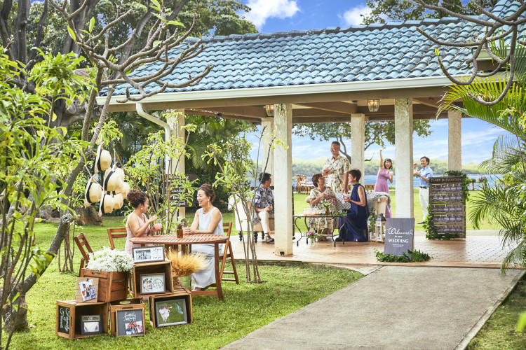 咲き誇るプルメリアの香りとハワイの水平線が南国気分を一層引き立てる広大なガーデン。ファミリーツリーと呼ばれる大きな木の下でウェディング!大きな木に包まれた木漏れ日で比較的涼しくお過ごしいただけます。