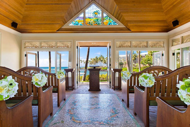ヒルトン・ワイコロア・ヴィレッジ内に佇む小さなチャペル。海を一望できる場所に建てられ、チャペル内は木のぬくもりに包まれ大きな窓が多いのも特徴。窓からは明るい光と潮の香りがハワイ挙式を演出します。