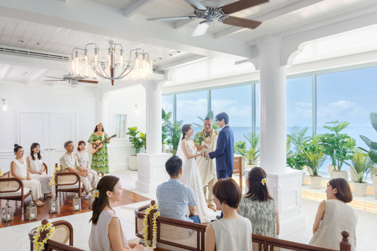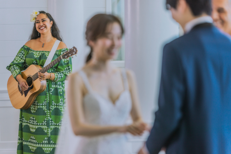 セレモニーは、カフー(司祭)がシェルを吹く音で始まり、ハワイらしいギターの演奏と歌声がチャペルを包み込みます。伝統的なハワイアンチャント(詠唱)が、新郎新婦とゲストに向けて丁寧に語りかけられ、最後にティーリーフレイを使ったバインディングセレモニーでお二人が手を取り合い、絆をさらに深め、祝福を受けます。このアロハセレモニーは、カハワイ・チャペルでしか味わえない特別な挙式です。