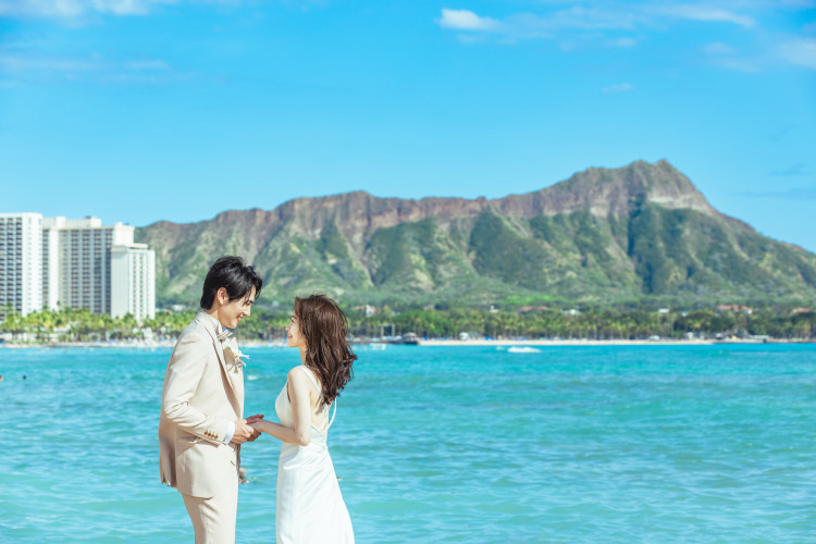 カハワイ・チャペルでの挙式プランには、ここで結婚式を挙げるカップルだけが楽しめる、アウトリガー・リーフ内の特別なフォトスポットでの撮影が含まれています。ホテルの前でダイヤモンドヘッドと広がる海を背景にしたオーシャンフォトや、ロビーやエントランス周辺など、様々なフォトスポットで、フォトグラファーがカップルと対話しながら撮影を進めます。